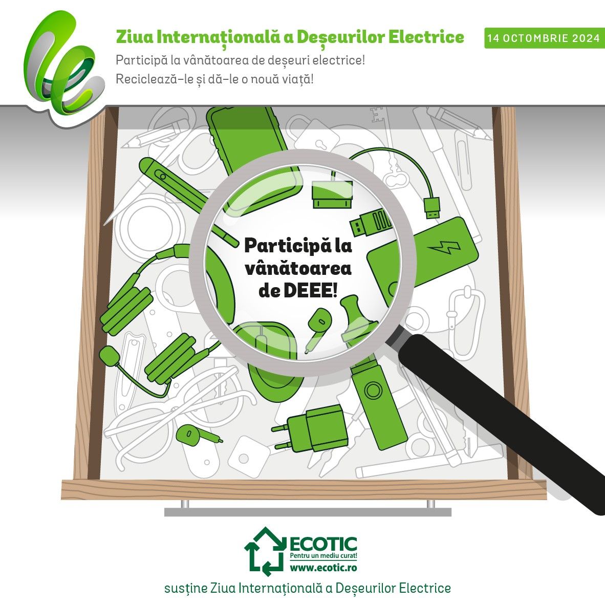 Ziua de 14 octombrie este din 2018 prilejul cu care o serie de organizații, la nivel internațional, aduc în atenția publicului larg, necesitatea colectării separate a deșeurilor de echipamente electrice și electronice și reciclarea acestora. În fiecare an, la nivel mondial, 14 milioane de tone de deșeuri de echipamente electrice și electronice ajung să fie aruncate împreună cu gunoiul menajer. Astfel, sunt risipite o serie de materii prime importante, unele dintre ele considerate critice: aluminiu, cupru, zinc și multe altele.