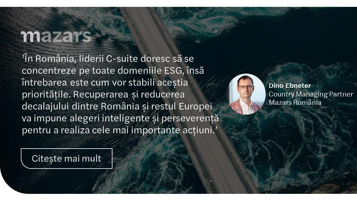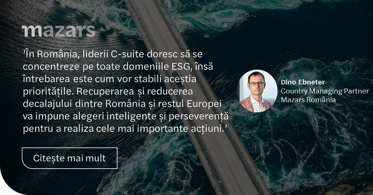 „Marea provocare este de a transforma intențiile și angajamentele în strategii realizabile. Este esențial ca factorii ESG să fie înțeleși și la nivel înalt, să fie încorporați în strategia de afaceri de bază și să existe un plan, care să fie urmat zilnic. Nu este o soluție rapidă, însă este important să începem demersurile cât mai repede posibil.”, a menționat Chris Fuggle, Co-Head of Sustainability, Mazars.