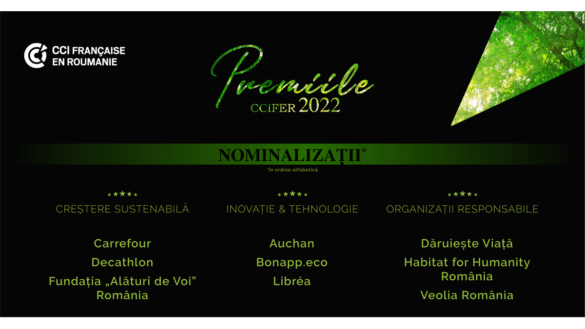 - După prima etapă de jurizare a Premiilor Camerei de Comerț, Industrie și Agricultură Franceză în România (CCIFER), juriul a anunțat 9 nominalizări la 3 categorii, dintr-un total de 54 de aplicații.