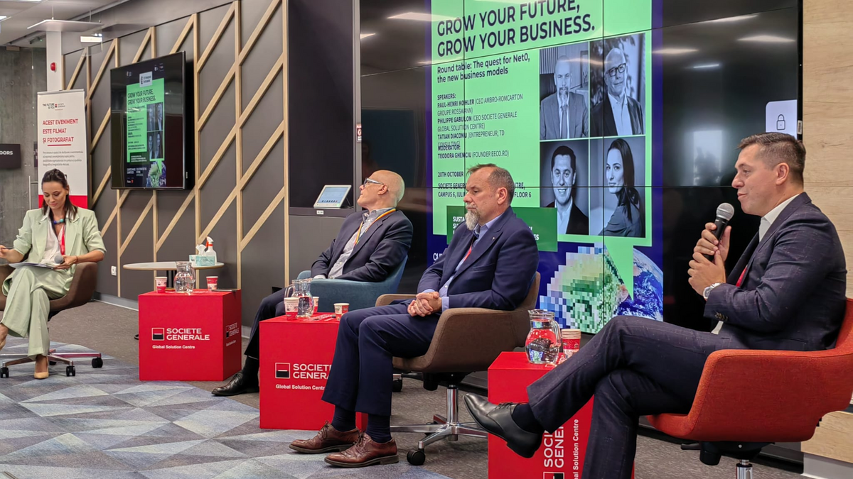 Philippe Gabulon (Societe Generale Global Solution Centre), Paul-Henri Kohler (Romcarton Ambro Groupe Rossmann) si Tatian Diaconu (TD Consulting) au descris provocările din companii, care sunt soluțiile pentru a reduce amprenta de carbon și ce investiții sunt necesare.