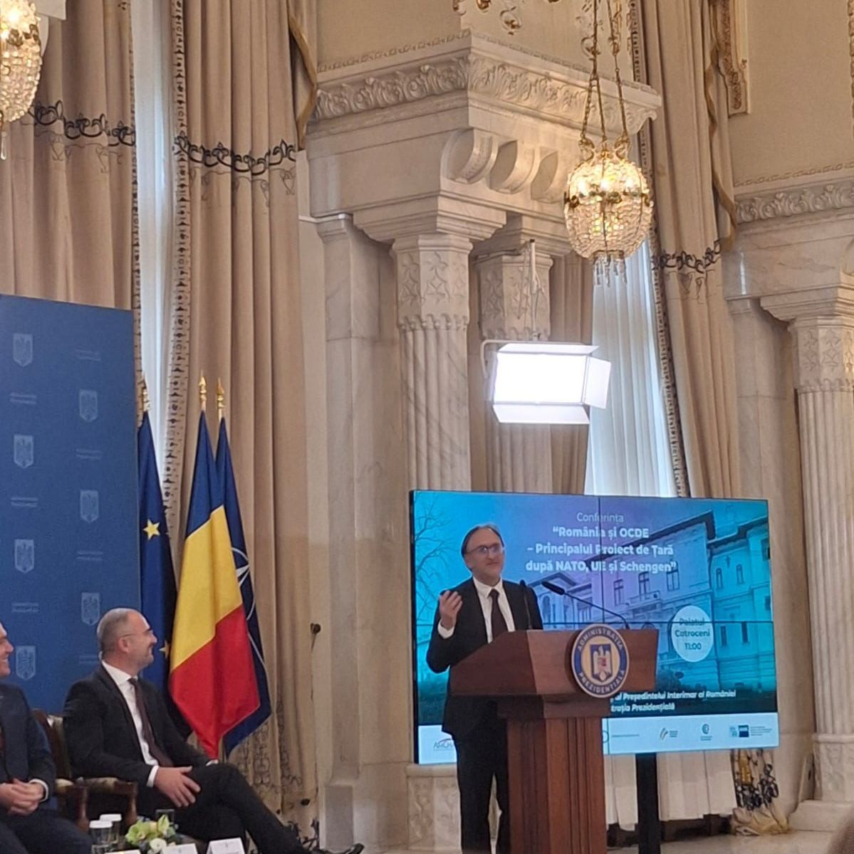 Palatul Cotroceni a găzduit pe 2 aprilie, conferința „România și OCDE – Principalul Proiect de Țară după NATO, UE și Schengen”, un eveniment de importanță strategică, desfășurat sub Înaltul Patronaj al Președintelui interimar al României. Evenimentul este organizat de Administrația Prezidențială, în parteneriat cu organizații de business precum AmCham România, Consiliul Investitorilor Străini, Confederația Patronală Concordia, caleaeuropeana.ro, Romanian Business Leaders, CCIFER și AHK România.