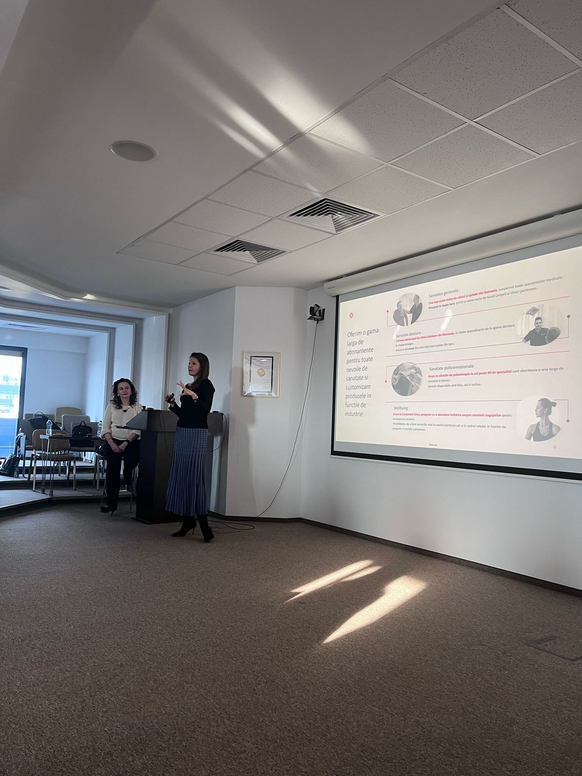 Georgiana Andrei, Director Comercial Regina Maria, a prezentat conceptul de wellbeing ca stare generală de sănătate, incluzând dimensiunile fizice, emoționale și psihologice. Ea a subliniat modul în care Regina Maria adaptează serviciile sale pentru a răspunde nevoilor diverse ale companiilor și angajaților acestora.