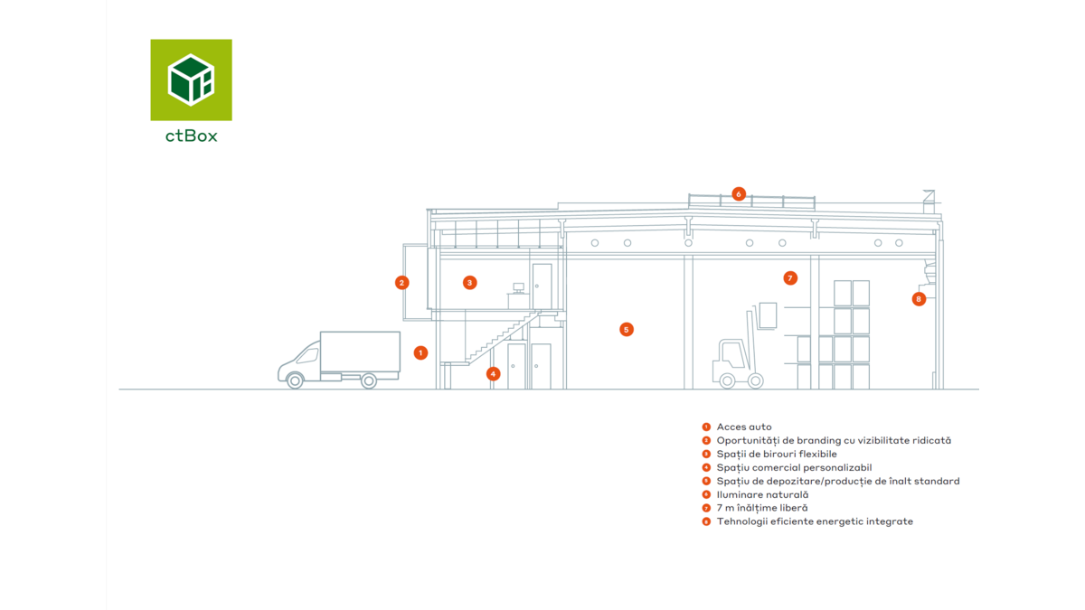 CTBox este un proiect dinamic creat pentru a oferi întreprinderilor mici și mijlocii (IMM-uri) spații flexibile care să le susțină creșterea într-o comunitate de afaceri vibrantă. Fiecare unitate, cu dimensiuni cuprinse între 500 și 600 de metri pătrați, integrează armonios spații de depozitare, birouri și showroomuri într-o clădire modernă.