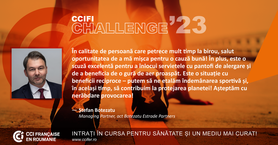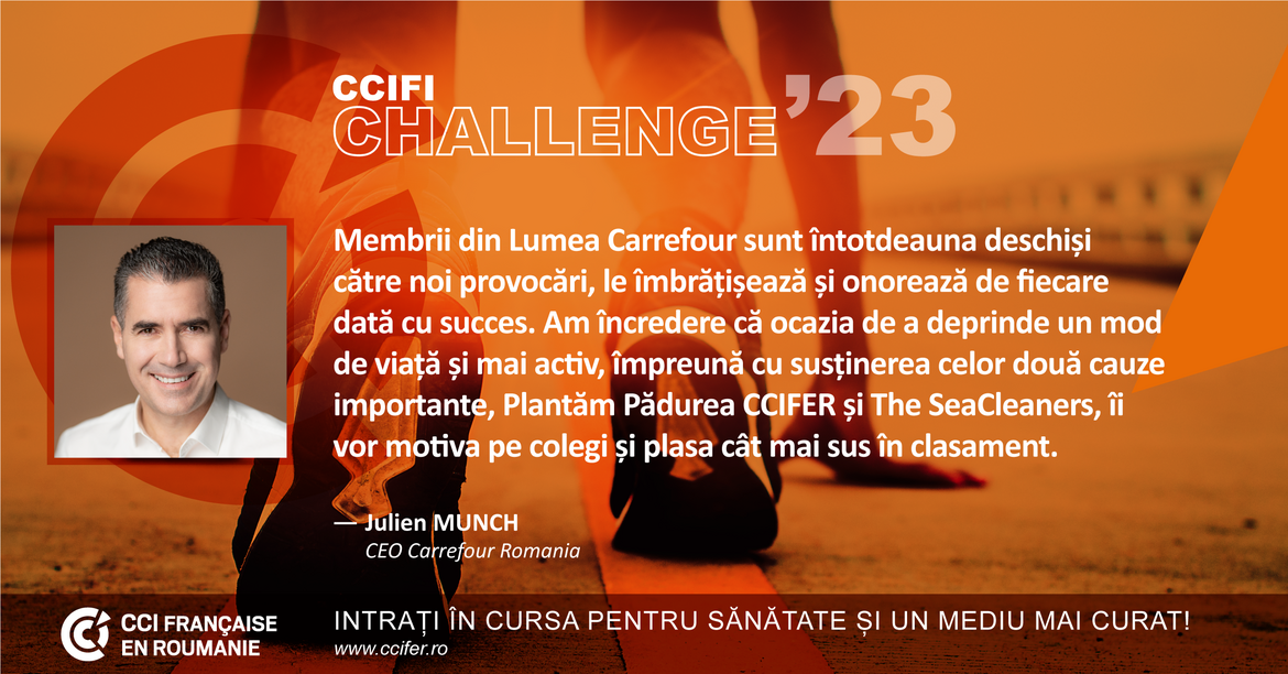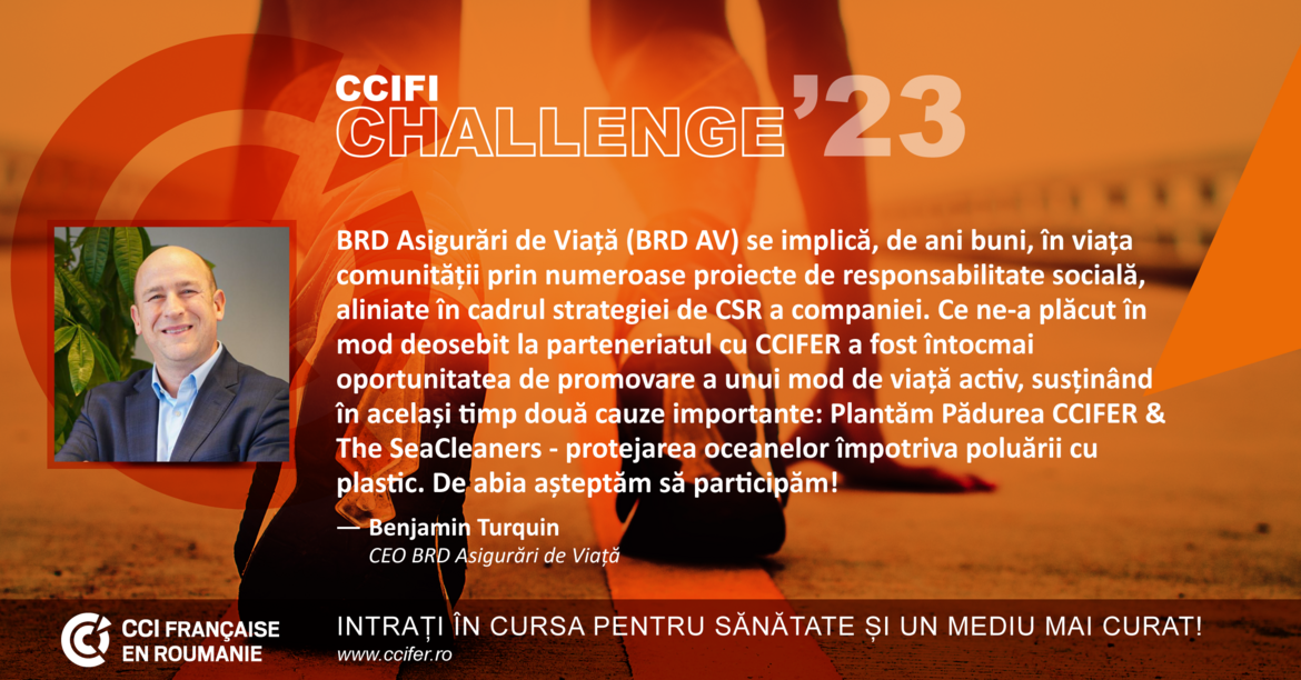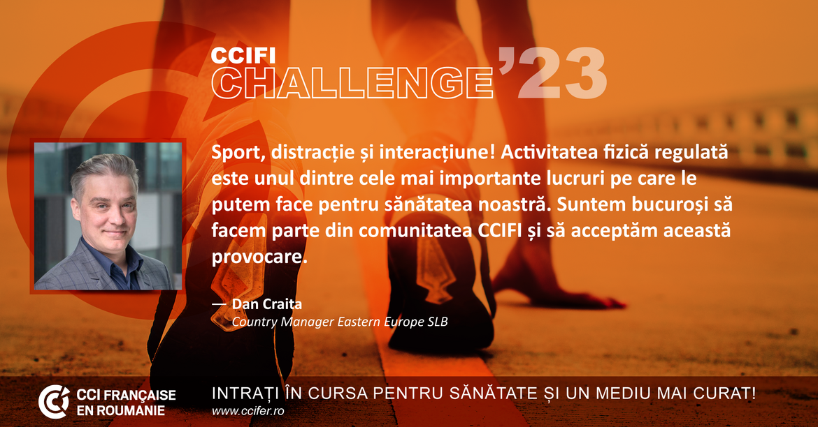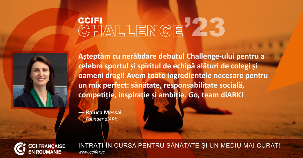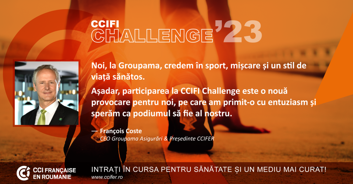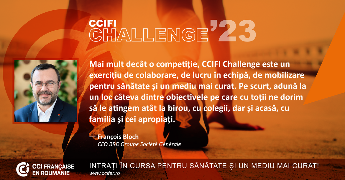 Mai mult decât o competiție, CCIFI Challenge este un exercițiu de colaborare, de lucru în echipă, de mobilizare pentru sănătate și un mediu mai curat. Pe scurt, adună la un loc câteva dintre obiectivele pe care cu toții ne dorim să le atingem atât la birou, cu colegii, dar și acasă, cu familia și cei apropiați. Le urez mult succes echipelor BRD angajate în acest eveniment, ca de altfel tuturor entuziaștilor sportului și naturii! Succes la Challenge!