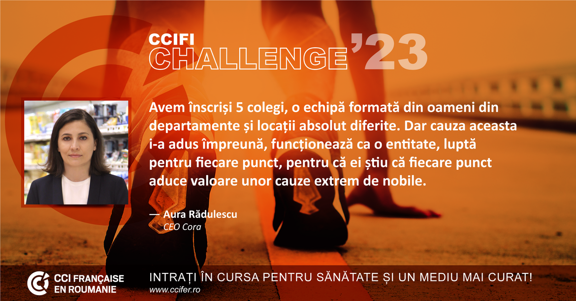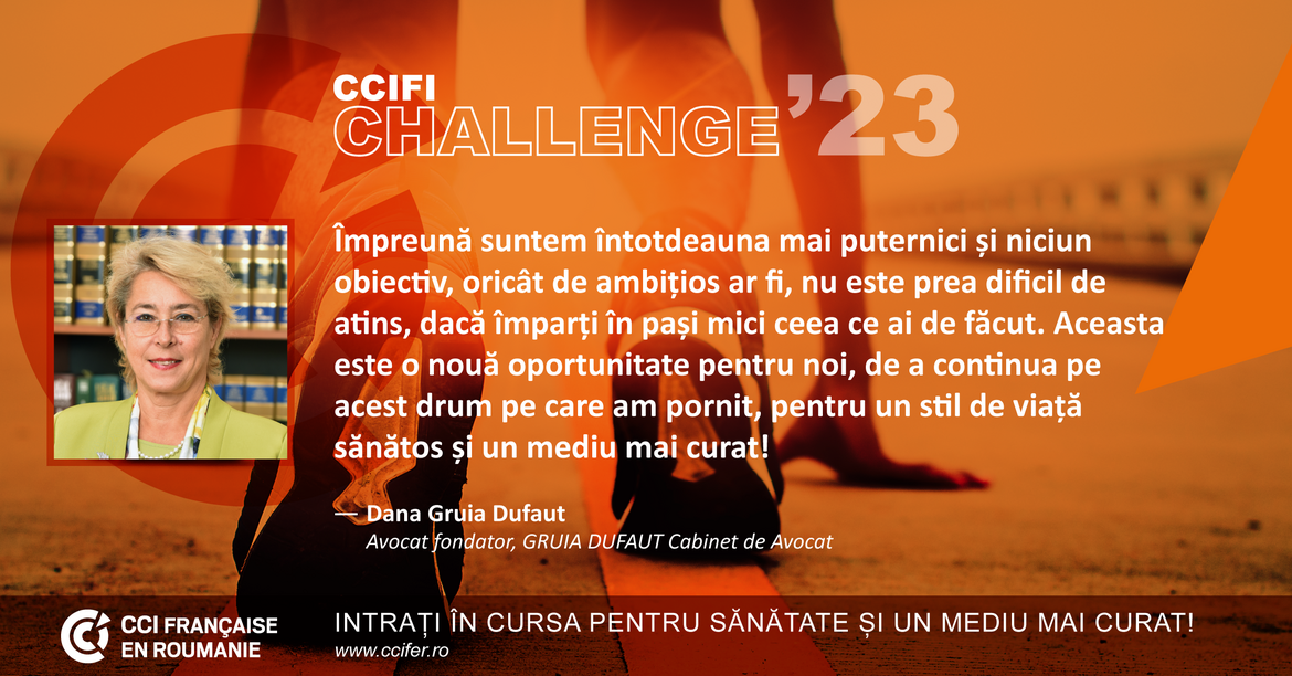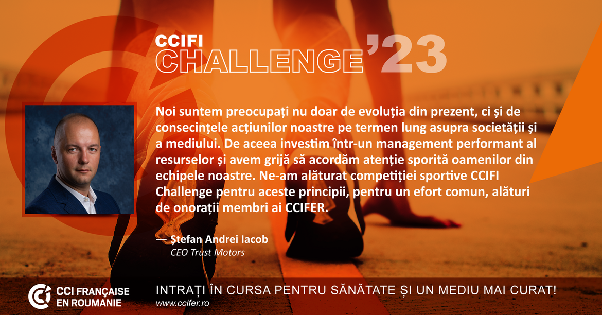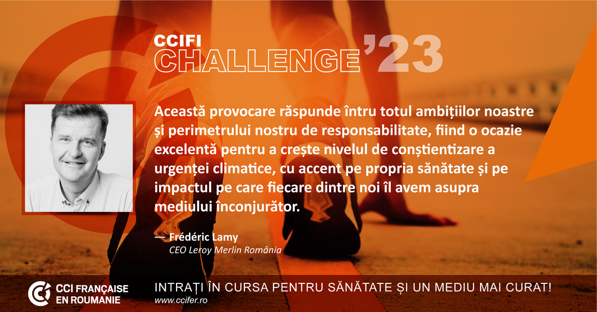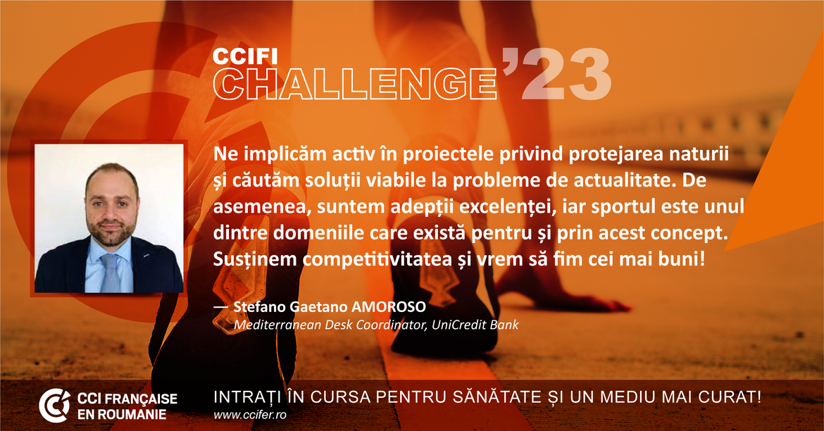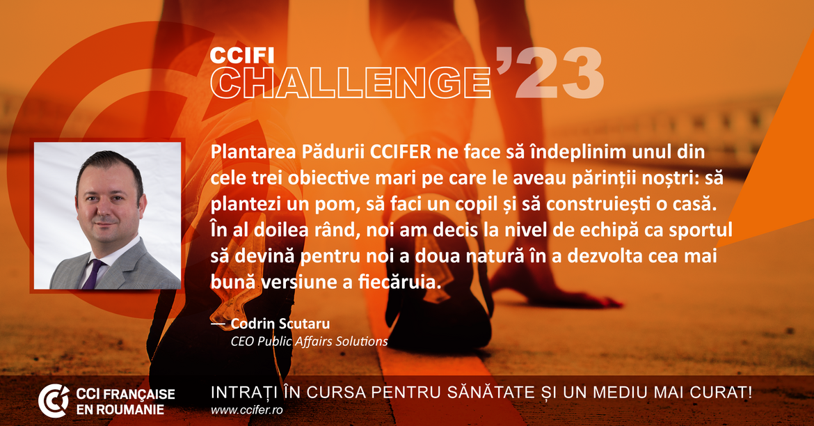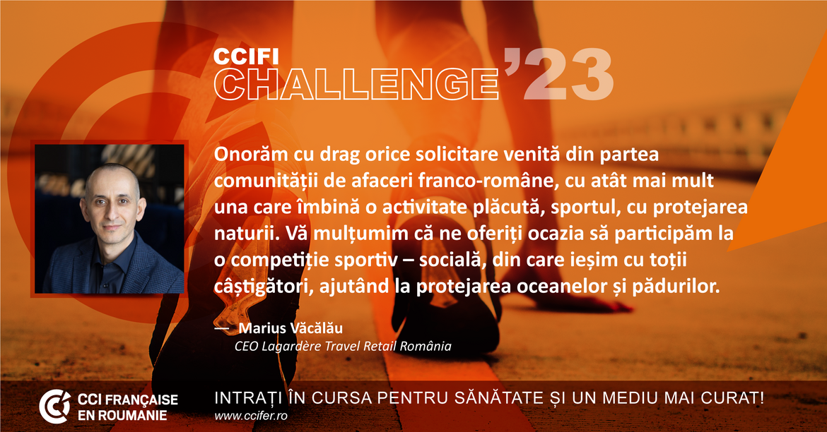 Mai mult decât o competiție, CCIFI Challenge este un exercițiu de colaborare, de lucru în echipă, de mobilizare pentru sănătate și un mediu mai curat. Pe scurt, adună la un loc câteva dintre obiectivele pe care cu toții ne dorim să le atingem atât la birou, cu colegii, dar și acasă, cu familia și cei apropiați. Le urez mult succes echipelor BRD angajate în acest eveniment, ca de altfel tuturor entuziaștilor sportului și naturii! Succes la Challenge!