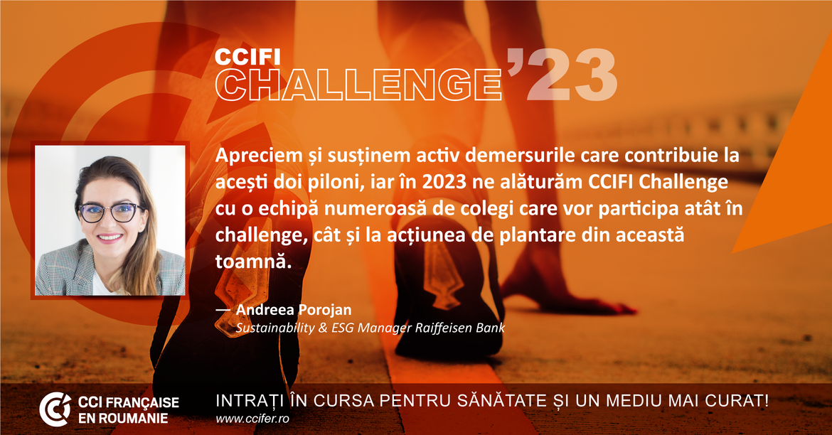 Sportul ca stil de viață sănătos reprezintă una dintre prioritățile de implicare ale Raiffeisen Bank, iar alergarea și mersul pe bicicletă sunt activități care contribuie atât la sănătatea noastră, cât și a planetei și pe care le încurajăm atât în rândul colegilor, cât și în comunitate. Apreciem și susținem activ demersurile care contribuie la acești doi piloni, iar în 2023 ne alăturăm CCIFI Challenge cu o echipă numeroasă de colegi care vor participa atât în challenge, cât și la acțiunea de plantare din această toamnă. Suntem nerăbdători să vedem rezultatele pozitive ale acestei competiții amicale derulate alături de ceilalți membri CCIFER din întreaga lume la finalul căreia să plantăm cât mai mulți copaci în Pădurea CCIFER!