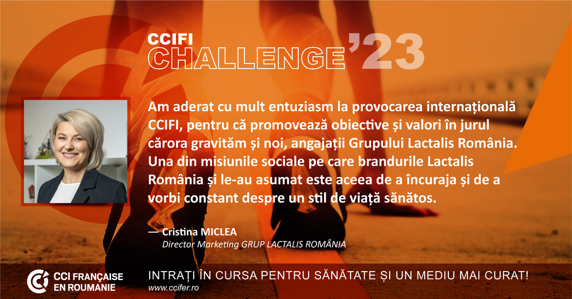 Am aderat cu mult entuziasm la provocarea internațională CCIFI, pentru că promovează obiective și valori în jurul cărora gravităm și noi, angajații Grupului Lactalis România. Una din misiunile sociale pe care brandurile Lactalis România și le-au asumat este aceea de a încuraja și de a vorbi constant despre un stil de viață sănătos. Iar din obiceiurile sănătoase fac parte indisolubil o nutriție echilibrată și sportul. Avem branduri activ implicate în competiții sportive, iar angajații noștri participă constant la aceste competiții alături de consumatorii noștri. De asemenea, diminuarea impactului companiei asupra mediului prin reducerea amprentei de carbon este un obiectiv strategic pe harta sustenabilității economice a Lactalis.