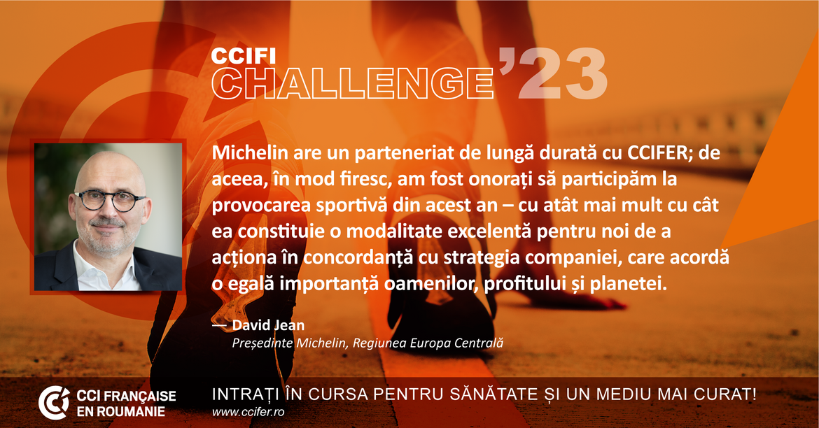 Michelin are un parteneriat de lungă durată cu CCIFER; de aceea, în mod firesc, am fost onorați să participăm la provocarea sportivă din acest an – cu atât mai mult cu cât ea constituie o modalitate excelentă pentru noi de a acționa în concordanță cu strategia companiei, care acordă o egală importanță oamenilor, profitului și planetei. Prin această lună de activități sportive, colegii noștri care au acceptat provocarea vor demonstra că duc un stil de viață sănătos, activ; dar vor contribui și la protejarea planetei, la reducerea emisiilor de CO2 prin alegerea unor soluții de mobilitate nepoluante și, mai târziu, prin plantarea de copaci în Pădurea CCIFER. De asemenea, este o mare plăcere să văd că, în Regiunea Europa Centrală, angajații Michelin participă la astfel de activități în această primăvară, fie prin intermediul CCIFI-urilor locale, cum ar fi în România și Ungaria, fie prin inițiative independente care vizează același obiectiv comun: oameni sănătoși pe o planetă sănătoasă.