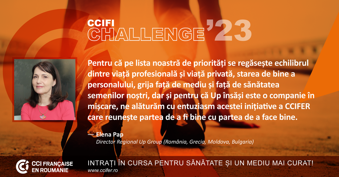 Mișcarea înseamnă viață, indiferent că vorbim despre oameni sau despre mediu. De la circuitul apei in natură și rotația Pământului, până la evoluția sau stagnarea unei companii, toate au la bază conceptul mișcării. Pentru că pe lista noastră de priorități se regăsește echilibrul dintre viață profesională și viață privată, starea de bine a personalului, grija față de mediu și față de sănătatea semenilor noștri, dar și pentru că Up însăși este o companie în mișcare, ne alăturăm cu entuziasm acestei inițiative a CCIFER care reunește partea de a fi bine cu partea de a face bine. Mult succes tuturor participanților, pentru că fiecare pas mic al lor este un pas mare către un mediu mai curat și mai sănătos.