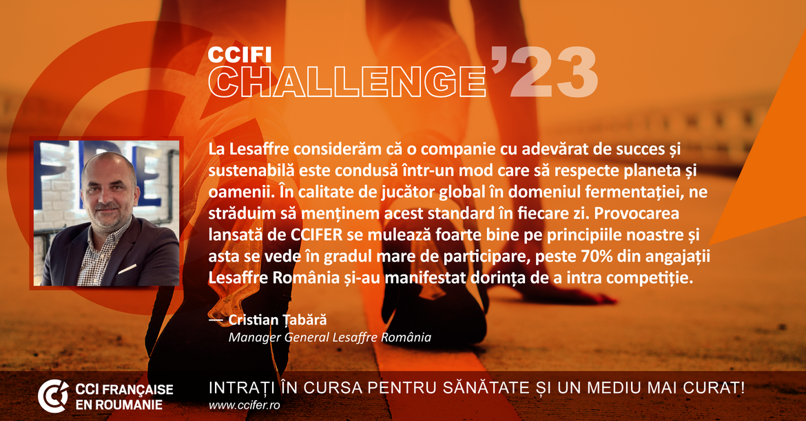 La Lesaffre considerăm că o companie cu adevărat de succes și sustenabilă este condusă într-un mod care să respecte planeta și oamenii. În calitate de jucător global în domeniul fermentației, ne străduim să menținem acest standard în fiecare zi. Compania noastră a fost întotdeauna dedicată hrănirii și protejării sănătății și bunăstării a cât mai multor oameni, păstrând în același timp resursele naturale din jurul nostru. Provocarea lansată de CCIFER se mulează foarte bine pe principiile noastre și asta se vede în gradul mare de participare, peste 70% din angajații Lesaffre România și-au manifestat dorința de a intra în competiție.