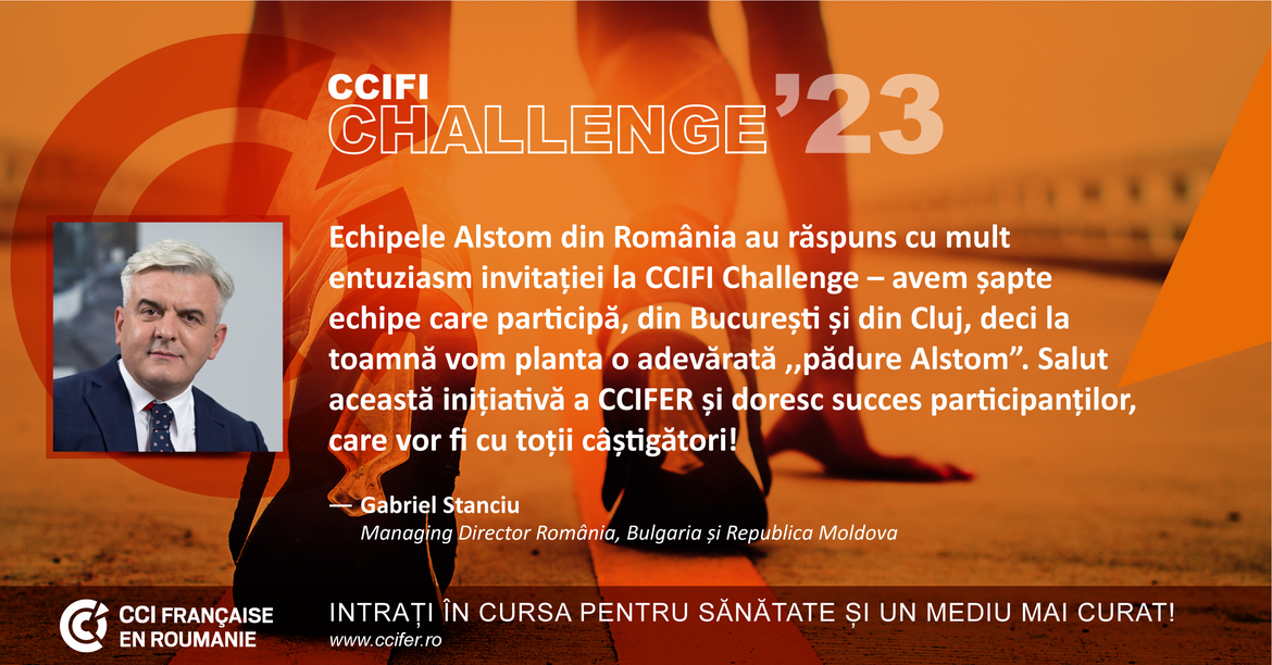 Alstom este lider mondial în mobilitate sustenabilă, deci pentru noi atenția față de mediu, precum și sănătatea și starea de bine a angajaților sunt priorități de prim rang. Echipele Alstom din România au răspuns cu mult entuziasm invitației la CCIFI Challenge – avem șapte echipe care participă, din București și din Cluj, deci la toamnă vom planta o adevărată ‚‚pădure Alstom”. Salut această inițiativă a CCIFER și doresc succes participanților, care vor fi cu toții câștigători!