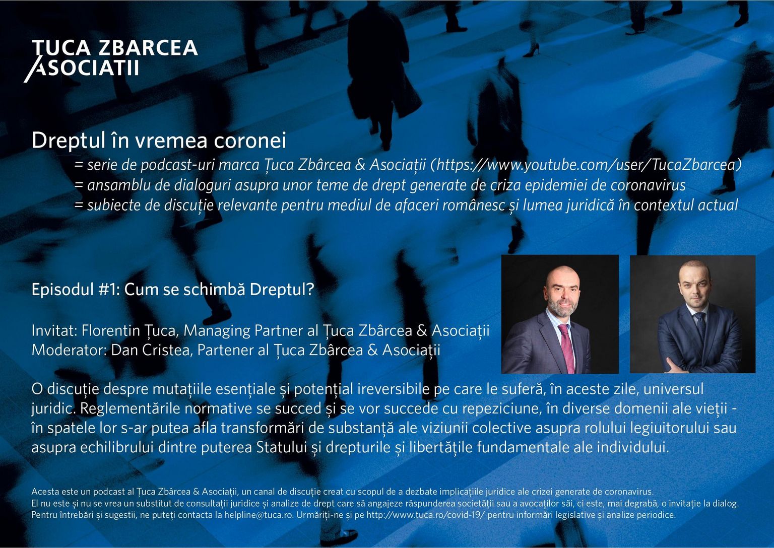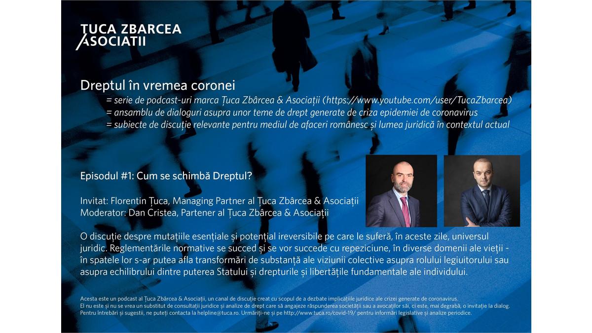 Invitatul primului episod este Florentin Țuca, Managing Partner al Țuca Zbârcea & Asociații, aflat în dialog cu Dan Cristea, Partener al Țuca Zbârcea & Asociații. Intitulat „Cum se schimbă Dreptul?”, acest podcast este o discuție despre mutațiile esențiale și potențial ireversibile pe care le suferă în aceste zile universul juridic. Reglementările normative se succed și se vor succeda cu repeziciune, în diverse domenii ale vieții - în spatele lor s-ar putea afla transformări de substanță ale viziunii colective asupra rolului legiuitorului sau asupra echilibrului dintre puterea Statului și drepturile și libertățile fundamentale ale individului. Care este atunci rolul juristului în aceste vremuri, care sunt coordonatele luptei pentru echilibru într-o lume legală marcată de profunde incertitudini, care sunt certitudinile pe care mediul de afaceri le poate avea din partea juridică, toate sunt subiecte ale primului episod al podcastului „Dreptul în vremea coronei”.