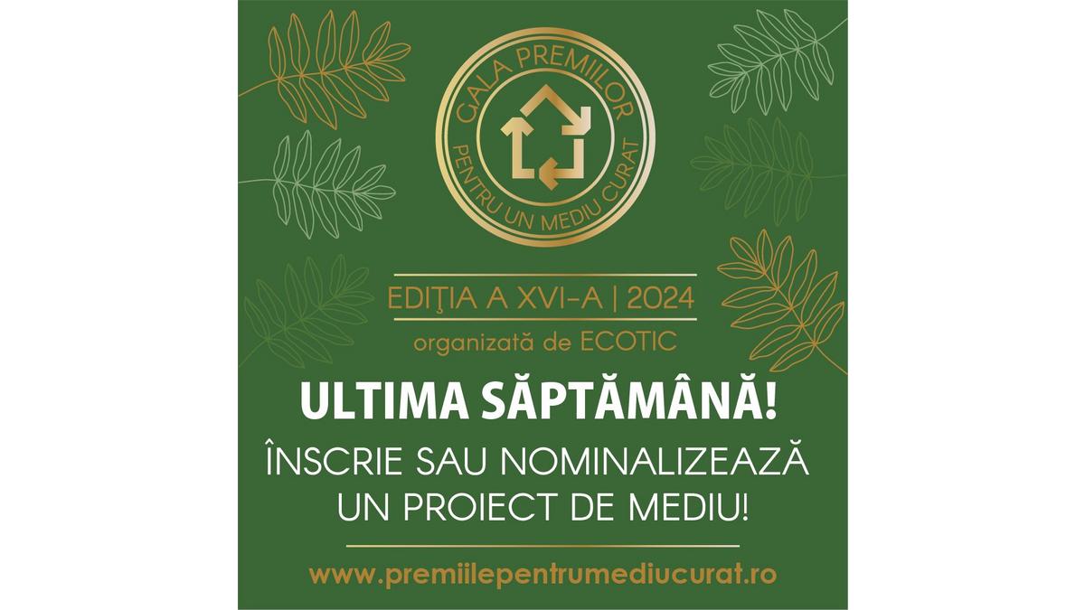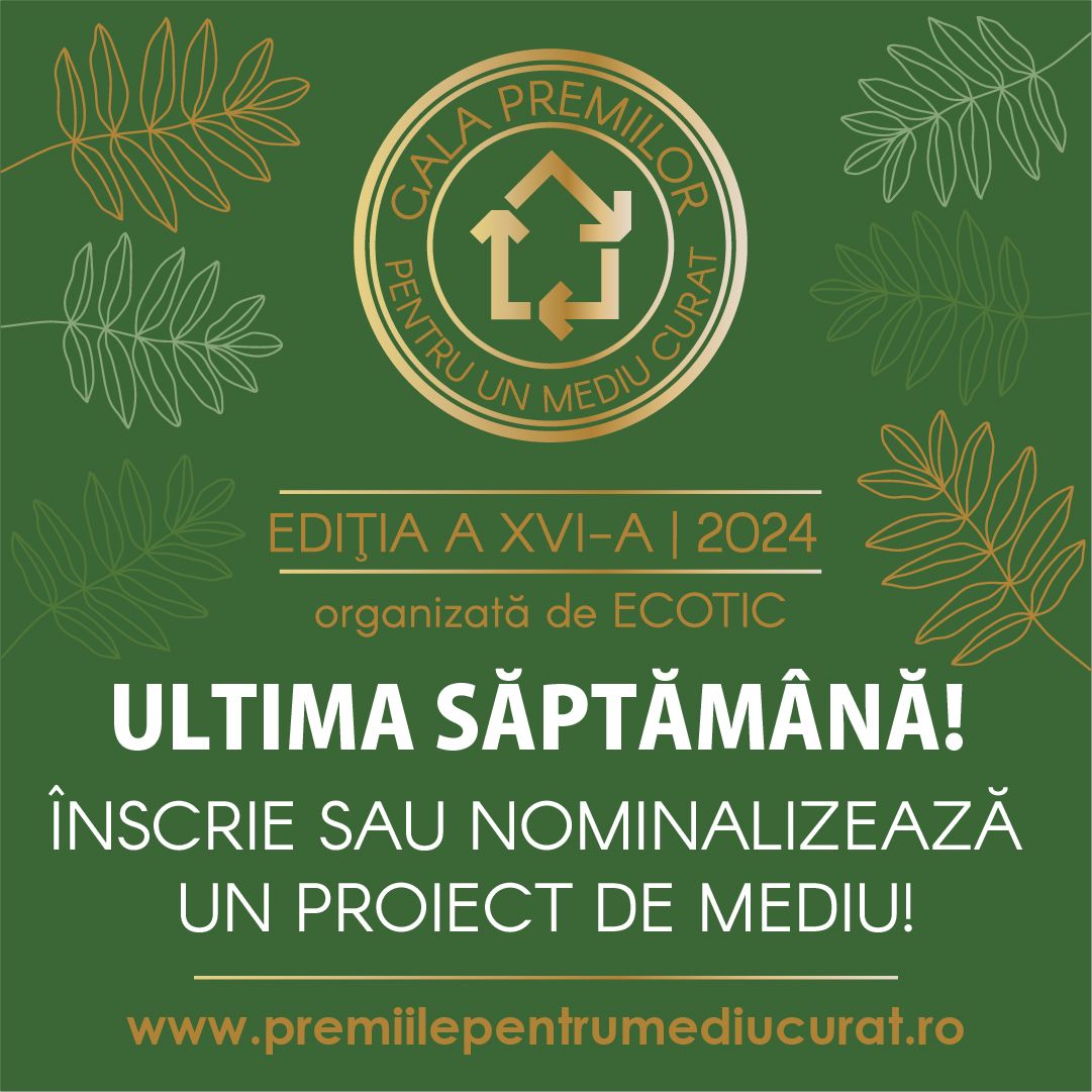 ECOTIC și Ministerul Mediului, Apelor și Pădurilor te invită să participi la a XVI-a ediție a Galei Premiilor pentru un Mediu Curat, o competiție care premiază inițiativele inovative și sustenabile pentru protecția mediului. Dacă ai dezvoltat un proiect care are un impact pozitiv asupra naturii și resurselor noastre, acum este momentul să îl faci cunoscut și să te alături celor care contribuie la un viitor sustenabil.