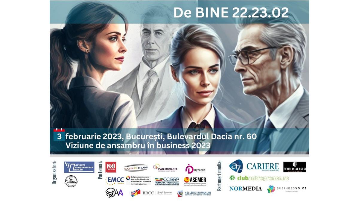 Cu suportul partenerilor: CONPIROM – confederație patronală reprezentativă la nivel național, Asociația Română a Industriei de Securitate, Professional Women’s Network România, European Mentoring and Coaching Council România, British Romanian Chamber of Commerce, CCI Francaise en Roumanie, Camera de Comerț Belgia Luxemburg România Moldova, Camera de Comerț Bilaterală Eleno-Română, Camera de Comerţ şi Industrie Bilaterală România Portugalia, Asociația companiilor spaniole din România (ASEMER), NAI România, Dynamic Business Connections, Conferința “De BINE 22.23.02 - Viziune de ansambru în business 2023” readuce în atenție potențialul pe care organizațiile patronale, asociațiile profesionale și camerele de comerț îl pun la dispoziția mediului de afaceri pentru dezvoltare și depășirea dificultăților inerente într-un mediu marcat de numeroase și ample provocări.
