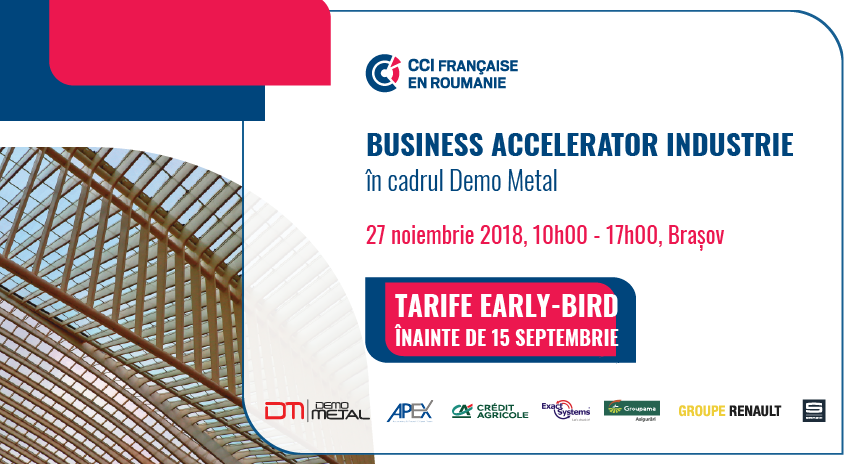 Camera Franceza de Comert si Industrie in Romania (CCIFER) are placerea de a va invita la Forumul de afaceri Business Accelerator, organizat in cadrul Demo Metal, in data de 27 noiembrie 2018, in intervalul orar 10h00-17h00, la Brasov.
