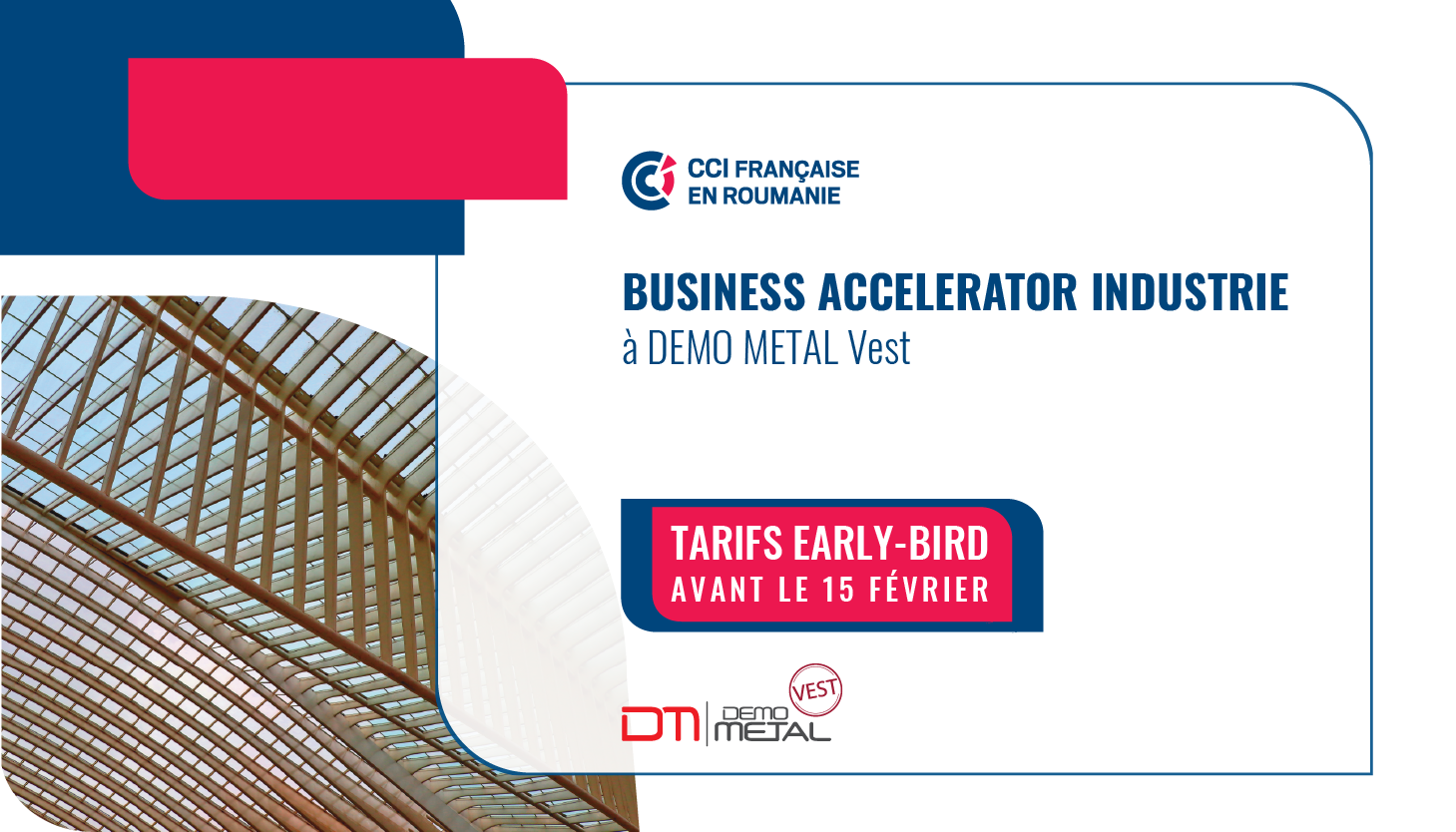 Camera Franceza de Comert si Industrie in Romania (CCIFER) are placerea de a va invita la Forumul de afaceri Business Accelerator, organizat in cadrul Demo Metal VEST si Demo Plast Vest, in data 23 mai 2019, in intervalul orar 10h00-18h00, la Expo Arad.