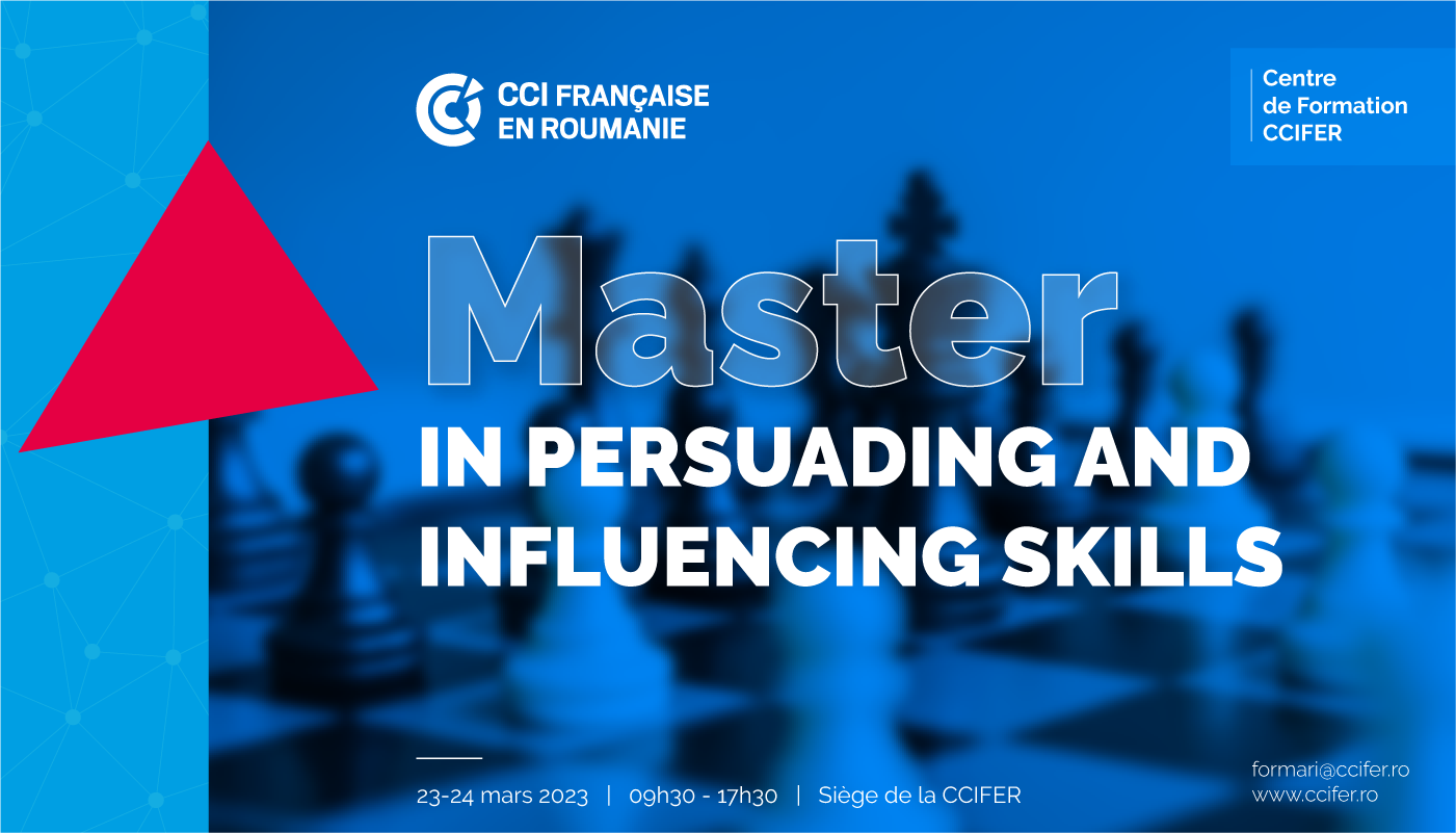 Centrul de formare CCIFER vă invită să participați la următoarea sesiune a programului de formare de doua zile al cărui scop este creșterea performanței în influențare si persuasiune, împreună cu dobândirea know-how-ului limbajului de influențare, echiparea cu multiple tehnici de persuasiune și aplicarea corectă a acestora în practică.