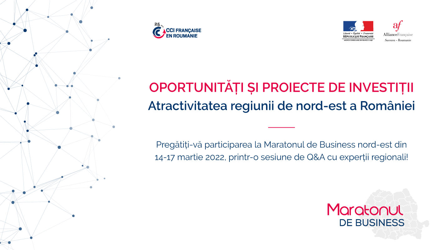 CCIFER, cu sprijinul Agenției Consulare a Franței la Iași și Alianței Franceze din Suceava au plăcerea de a vă invita la o incursiune digitală în regiunea de nord-est a României pentru a descoperi oportunitățile de investiții, finanțare și dezvoltare a proiectelor sectoriale.