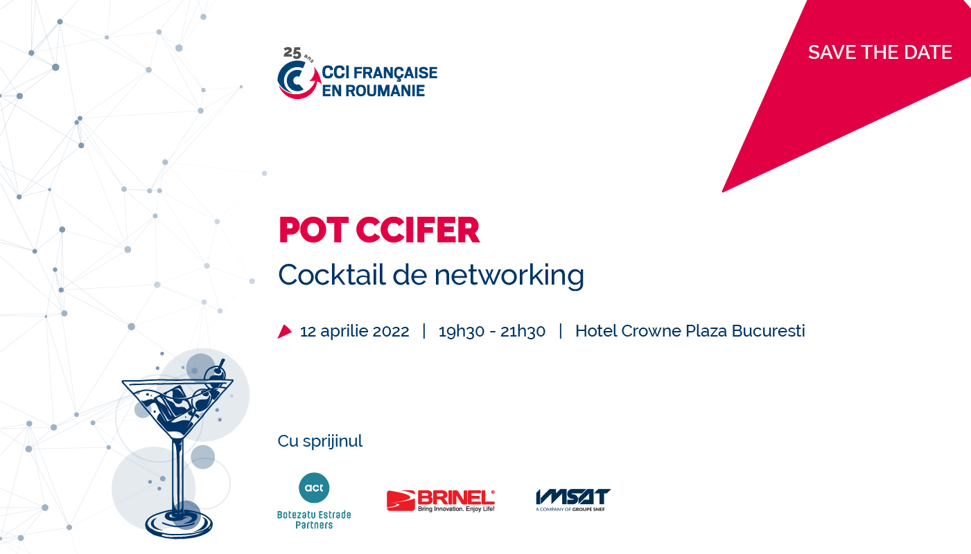 CCIFER, în parteneriat cu act Botezatu Estrade Partners, Brinel și Imsat au plăcerea de a vă invita la un Cocktail de networking organizat în prezența reprezentanților mediului de afaceri franco-român.