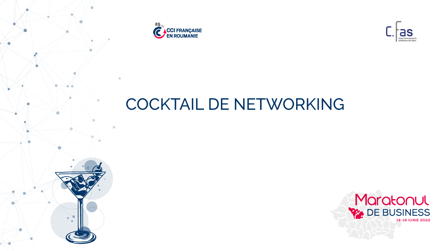 CCIFER și Clubul Francofon de Afaceri din Sibiu (CFAS) au plăcerea de a va invita la un Cocktail de networking organizat în prezența reprezentanților autorităților publice locale, universităților și mediului de afaceri franco-român.