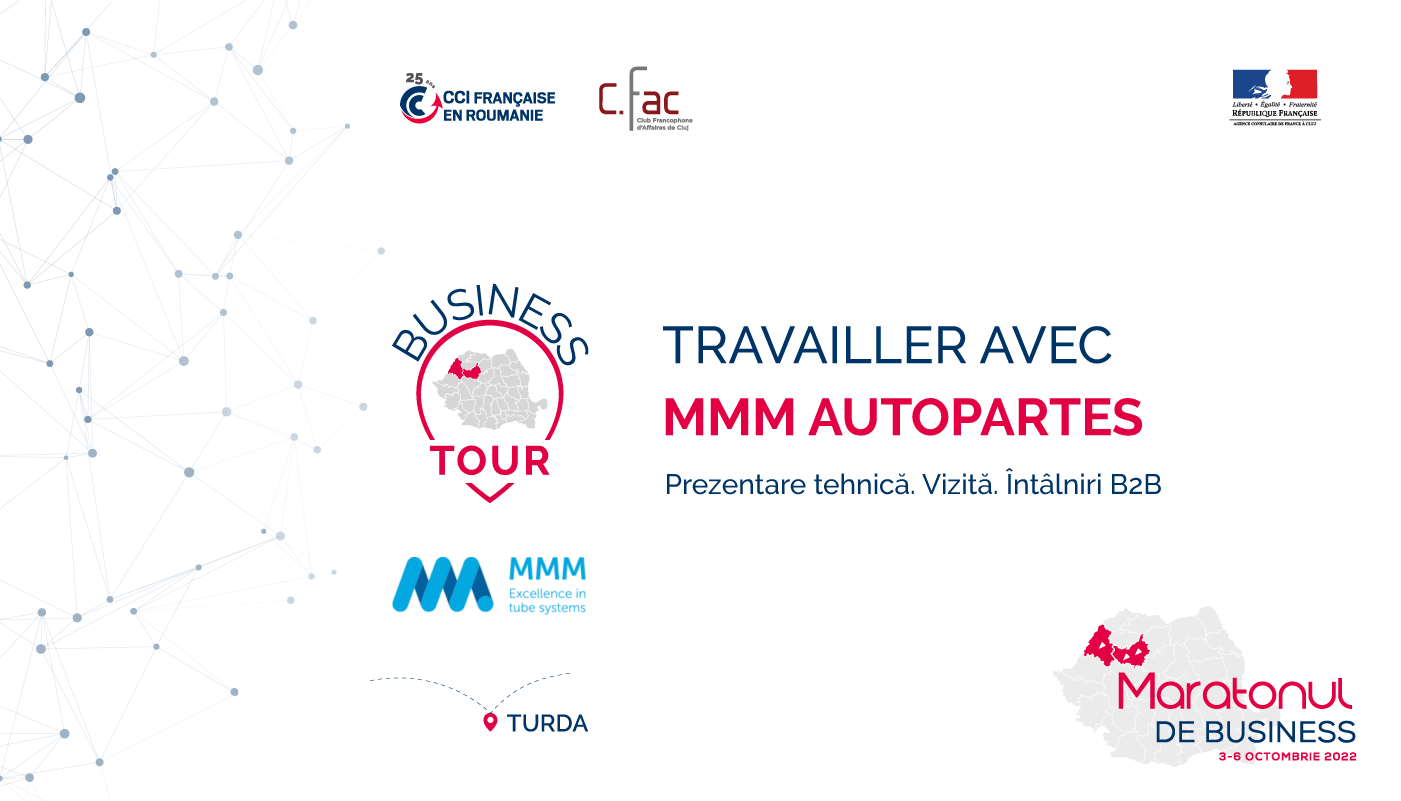 Taxa de participare la toate evenimentele « Business Tour – Travailler avec » care vor avea loc în perioada 3-6 octombrie 2022, la Oradea, Cluj-Napoca și Turda este de 300 EUR+TVA/persoană.