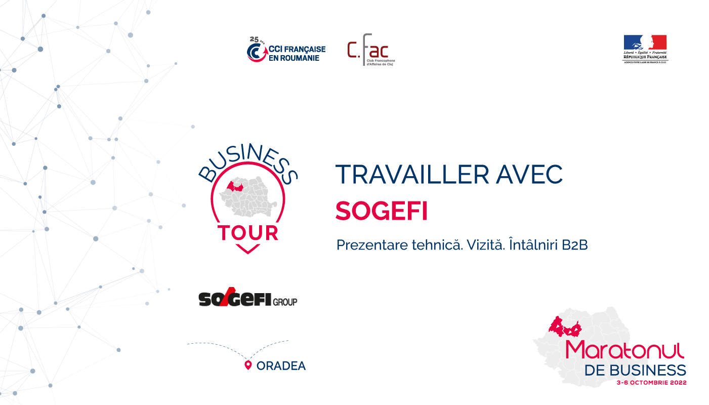 Taxa de participare la toate evenimentele « Business Tour – Travailler avec » care vor avea loc în perioada 3-6 octombrie 2022, la Oradea, Cluj-Napoca și Turda este de 300 EUR+TVA/persoană.